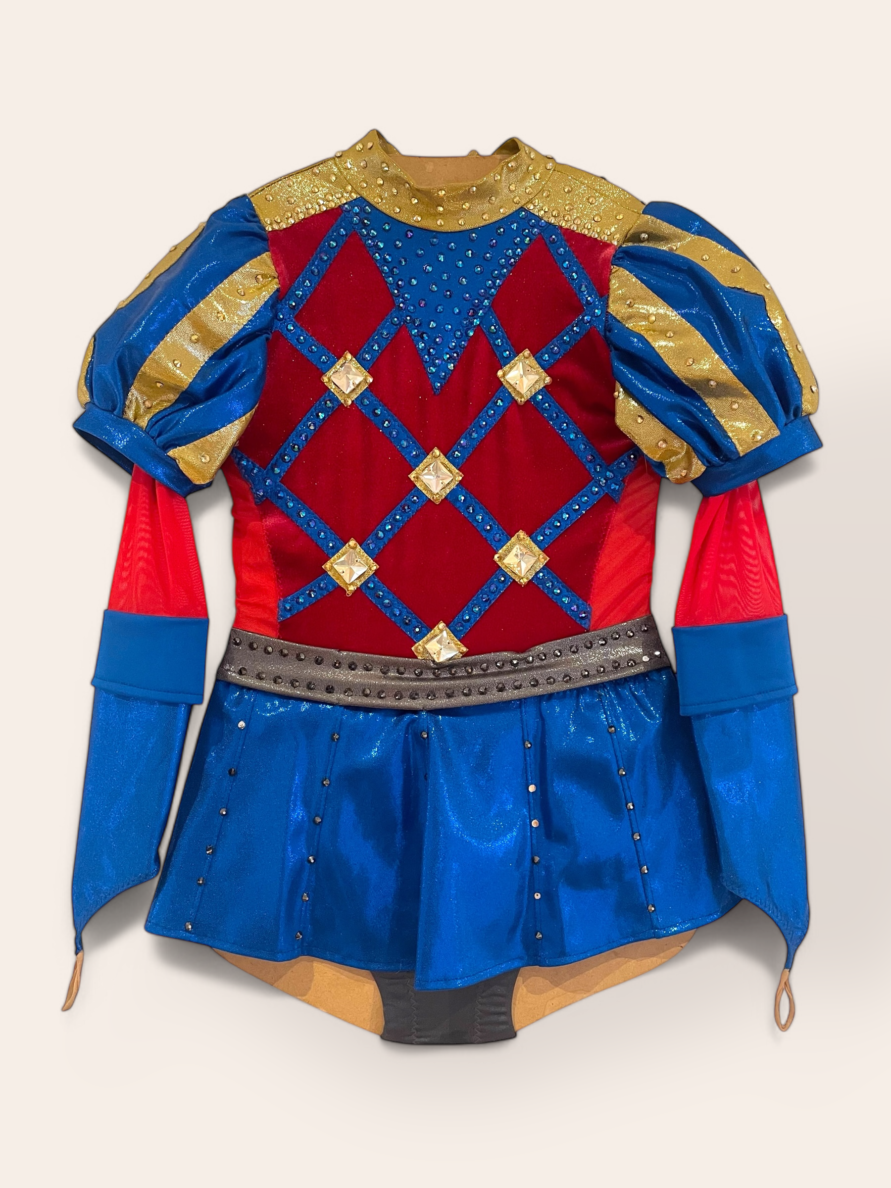 Regal red and blue, sized girls 8 Wendle. Heavily gemmed with crystals and mirror shards. Sparkles from every angle. Stage-ready. Excellent condition.