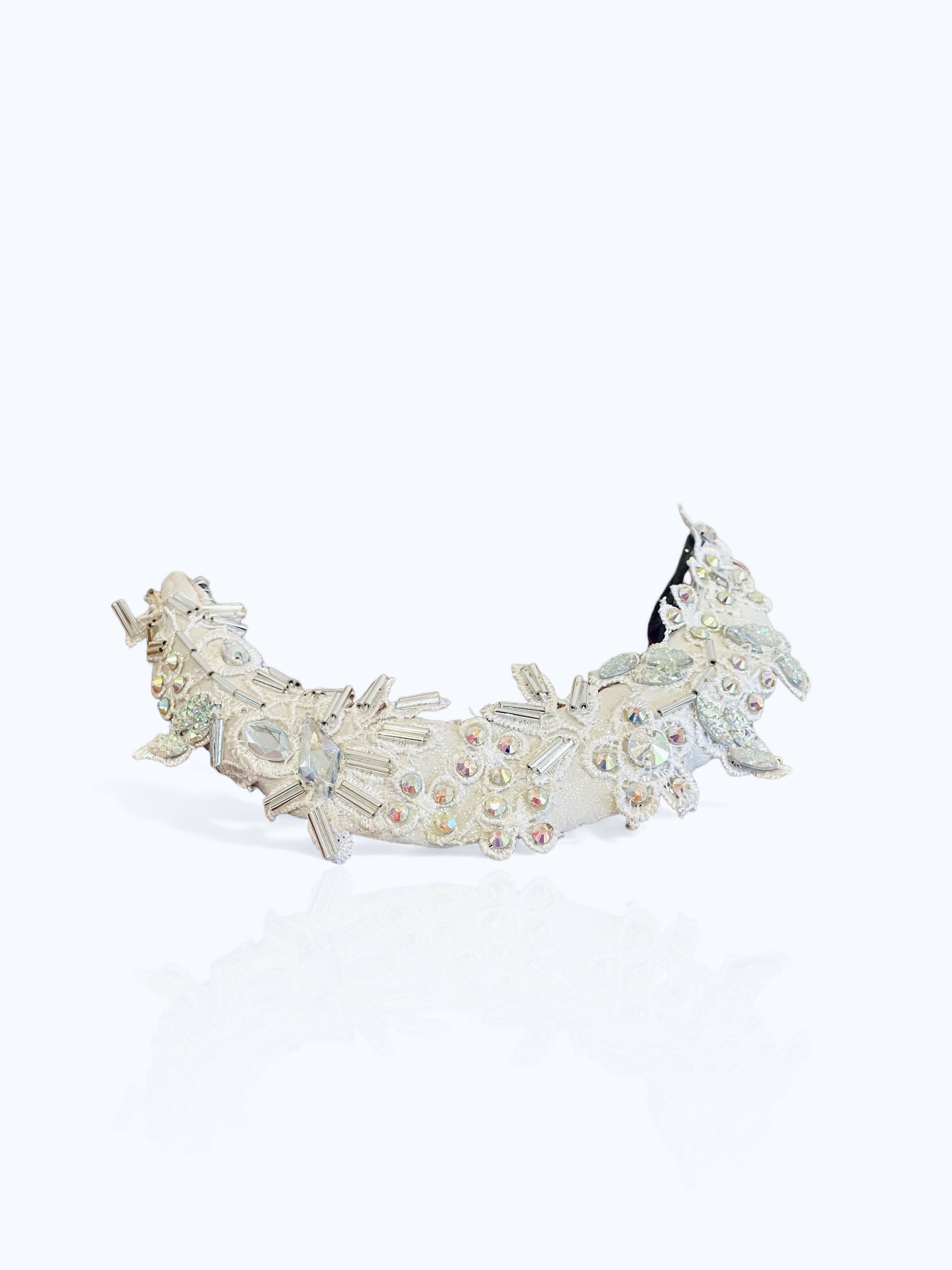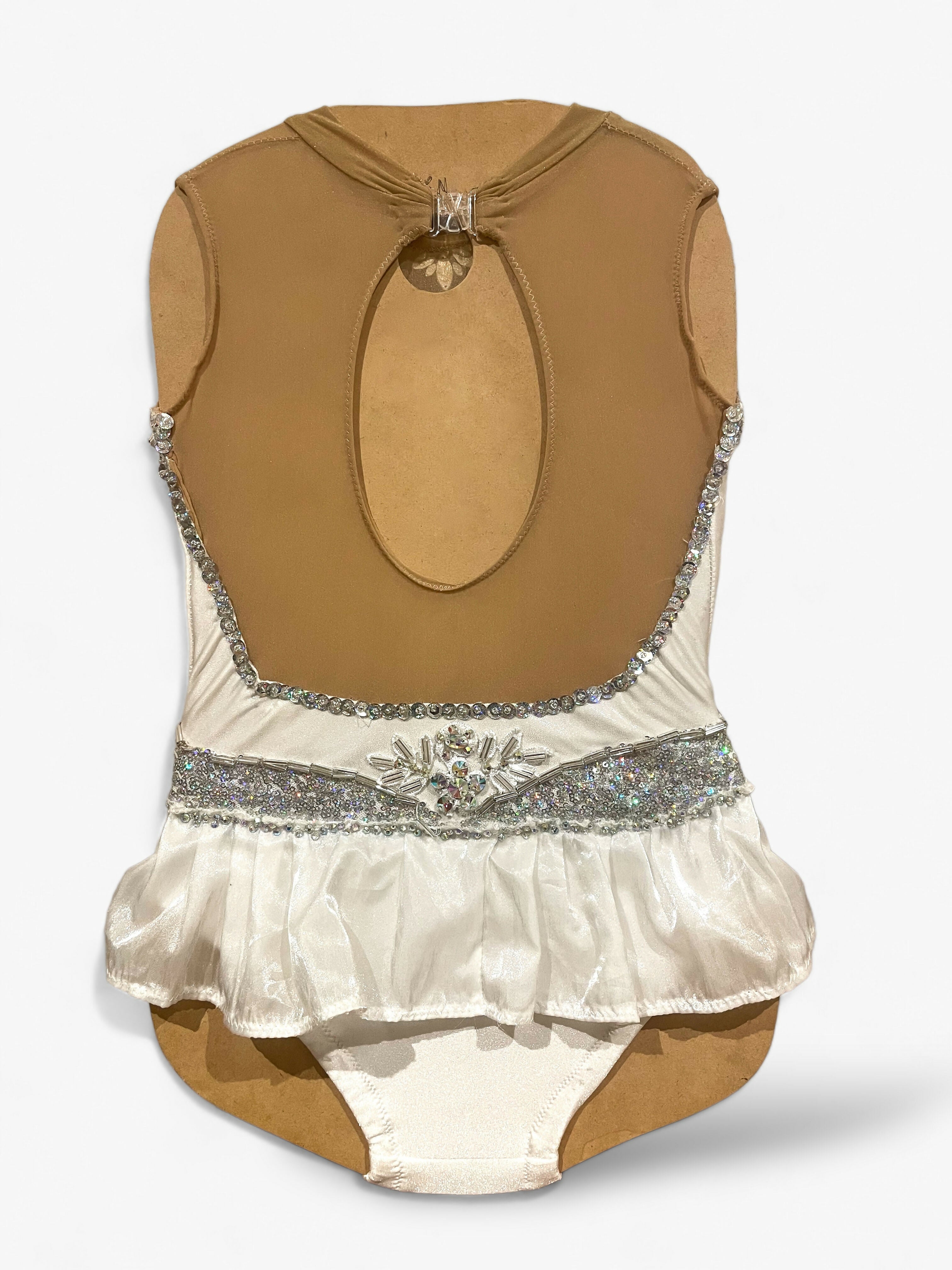 Silver floral embroidery, rhinestones, and AB crystals. Sized girls 6. Sparkles very brilliantly on stage. Comes with headpiece.