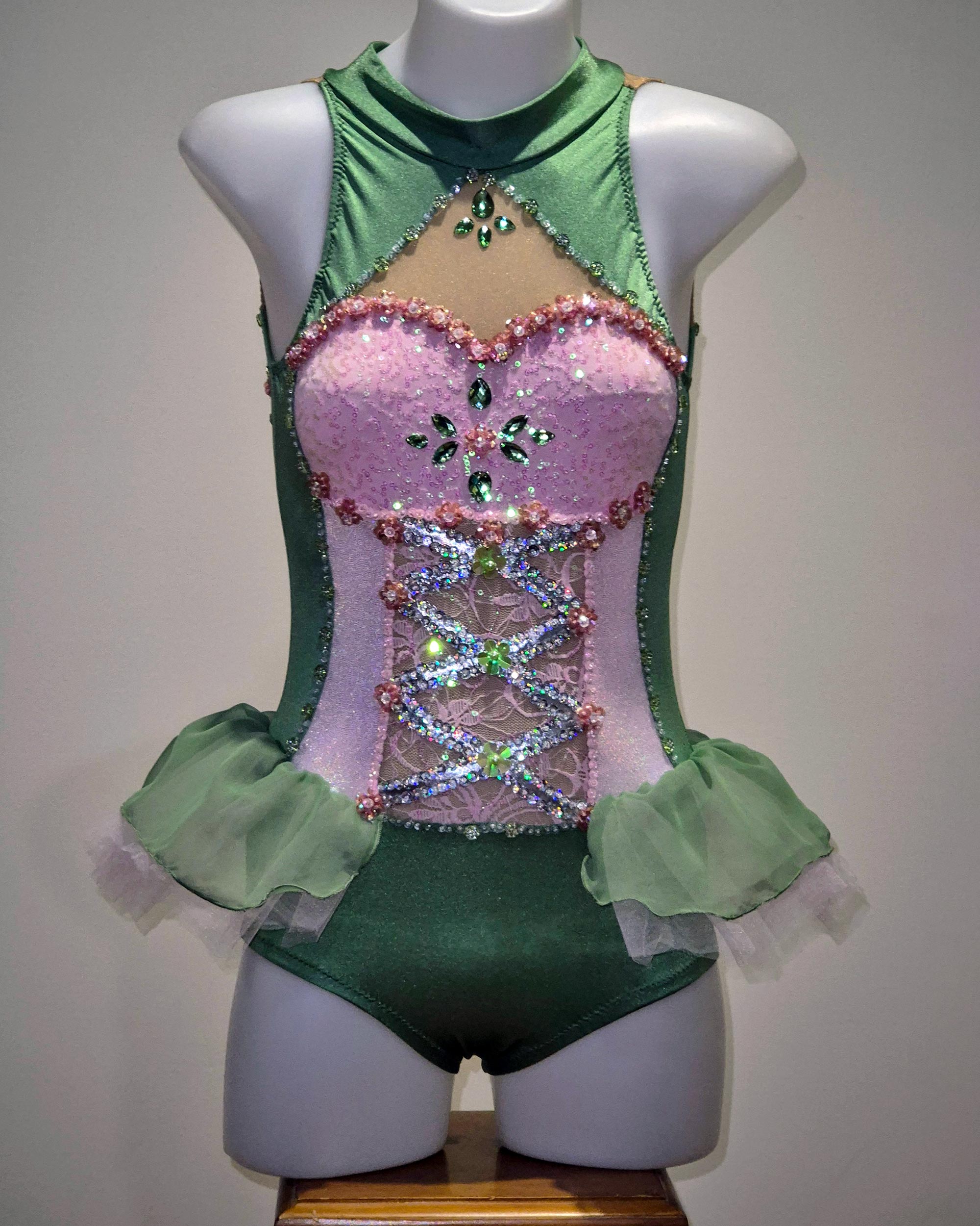 Brand new by Natalia Grossi. Giada in seaweed and pale pink Italian linen with chiffon skirt and tulle underlay. Lace front, zsa zsa bust, floral beads, silver + pink sequins, peridot gems. Sweet and stage-ready.