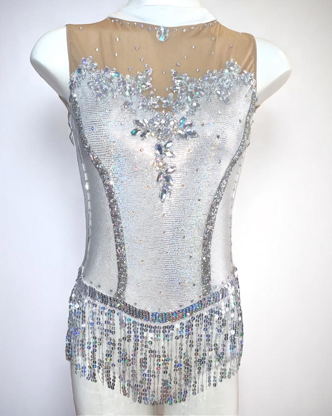 Freshly made and fizzing with stage presence, this sparkling white number by Natalia Grossi is as zesty as lemonade on a summer day. With sequin fringe and a dusting of AB crystals and gems, she shimmers from every angle. Brand new and born to shine.