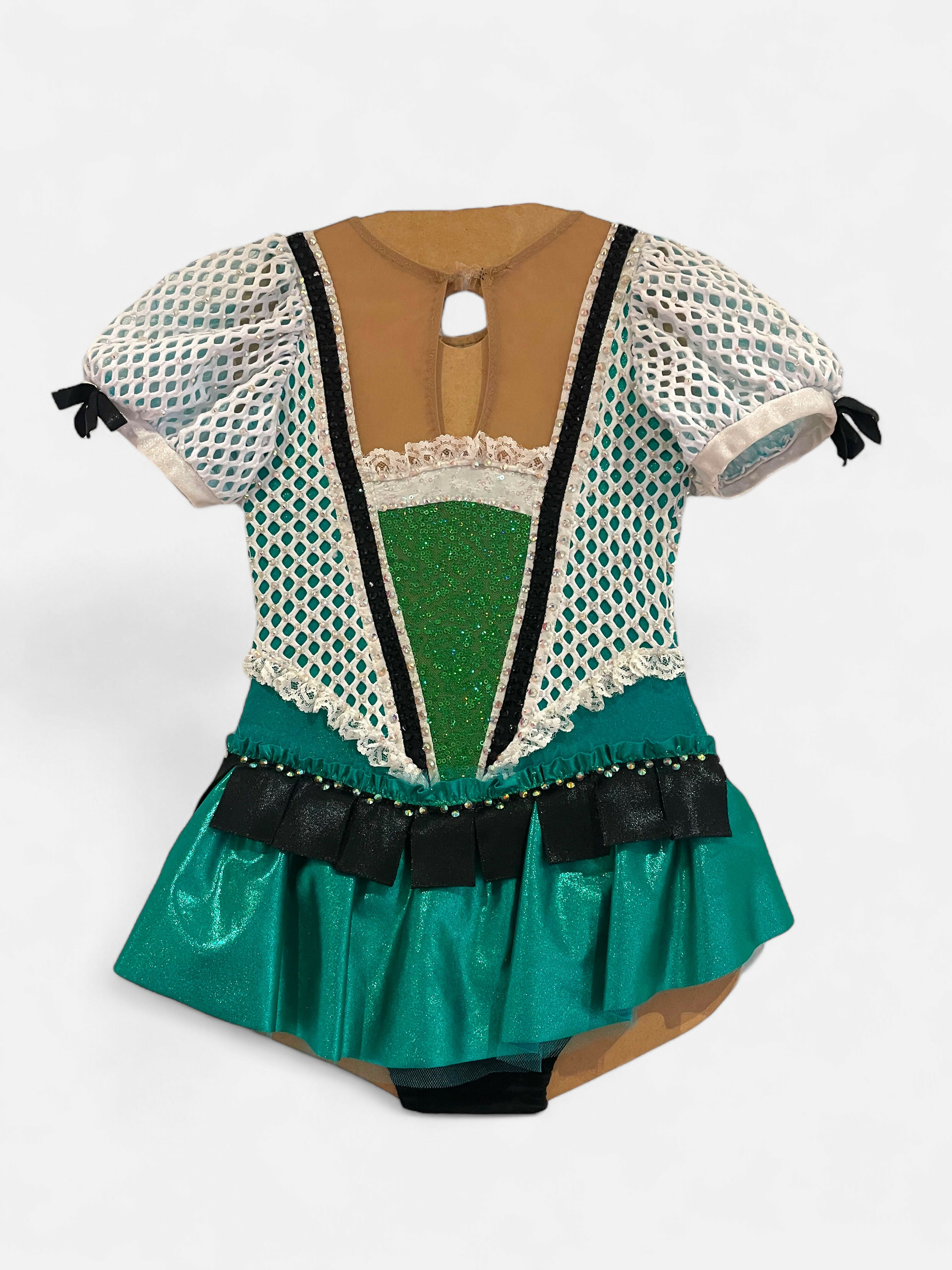 Emerald green, Wendle, girls 8, creation. Bedecked with AB gems that shimmer like the lights of the Emerald City, and accented with playful lace, ribbons and skirt. Excellent condition.